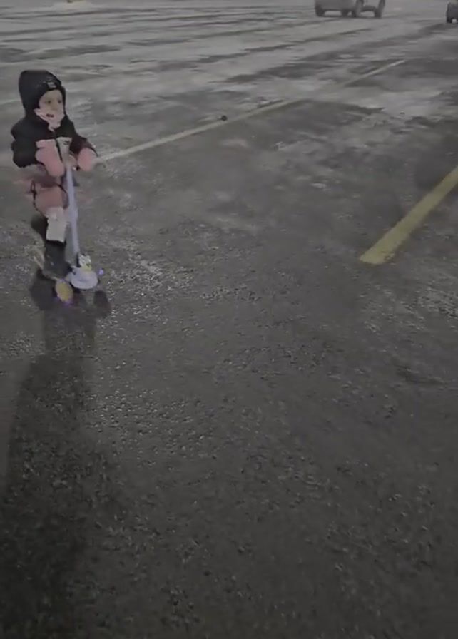 - "A child in a dark hooded jacket, pink vest, and light-colored pants rides a blue scooter with flashing lights on an asphalt parking lot at night" by FM-63mZD2, licensed under CC BY 4.0