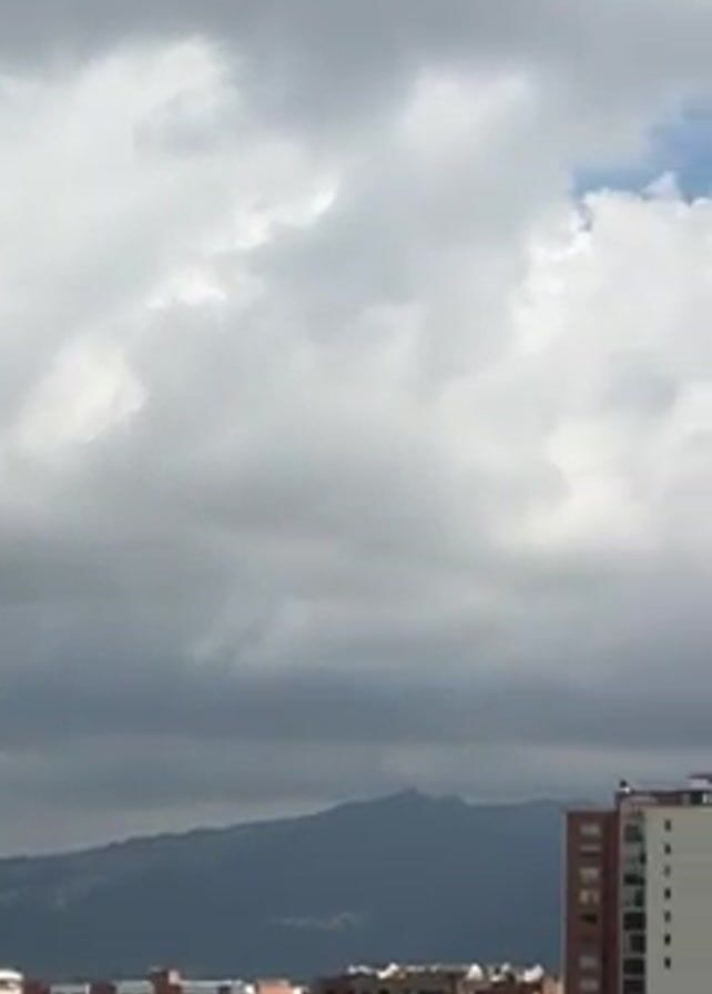 cloudy sky with white and dark grey clouds. At the bottom of the frame, there is a row of buildings and some trees. In the background, mountains are visible, partially obscured by the clouds. The clouds change from mostly dark grey to patches of blue sky with fluffy white clouds.