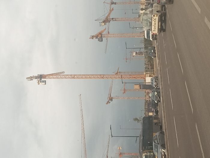 The image displays a cityscape with numerous orange construction cranes dominating the horizon. A line of vehicles, including a Toyota truck, proceeds along a road beside the construction site. Streetlights punctuate the scene. A cloudy sky serves as the backdrop for the cranes, suggesting ongoing urban development.