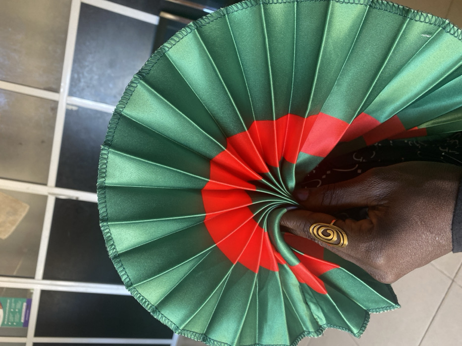 A dark-skinned hand, adorned with a gold-toned spiral ring on the ring finger, holds a section of tightly pleated fabric. The fabric is predominantly emerald green, fanning out with rigid pleats from the hand's grasp, and features a prominent red design centrally positioned, appearing as an arc against the green. The visible portion of the fabric's perimeter is finished with a dark green stitched hem. A dark, long-sleeved garment is visible at the wrist. The background is shallowly focused, displaying blurred architectural elements comprising light-colored vertical and horizontal frames, consistent with window panes or internal partitioning, against a darker, indistinct interior. A partial light-green sign is faintly visible in the upper left background. This scene is situated in Jos, Nigeria.