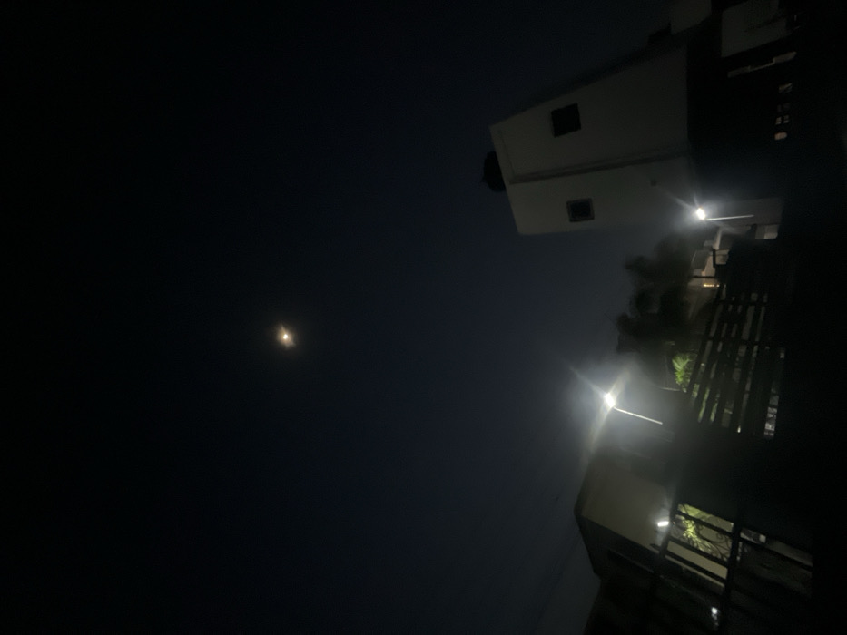 A night shot of a dark sky with a small, faint moon in the distance. A building is visible on the right, illuminated by streetlights, with visible railings. The scene is dim and the building is a white or light color. There are some visible plants or trees nearby.