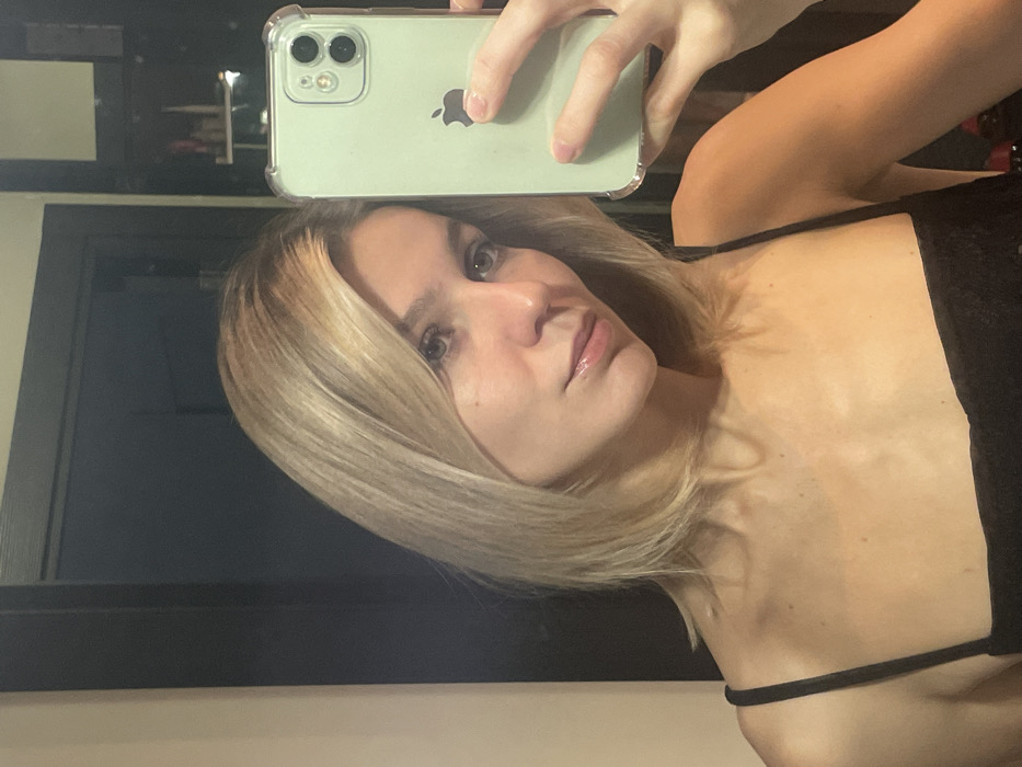 The scene is an indoor, private setting, located within the city of Moscow, Russia. A fair-skinned adult female, appearing from the chest up, is shown taking a mirror selfie. She has straight, shoulder-length blonde hair with a side part and light-colored eyes. She is wearing a black top with spaghetti straps. Her right hand, positioned in the lower right foreground, holds a light-green smartphone, identifiable as an iPhone by the visible Apple logo on its back, enclosed within a clear protective case. Her gaze is directed towards the phone's camera. The background, visible in the mirror's reflection, displays a dark, undifferentiated area on the left, possibly an unlit room or doorway, and a partial reflection of a vertical structure and horizontal shelves containing indistinct objects on the right.