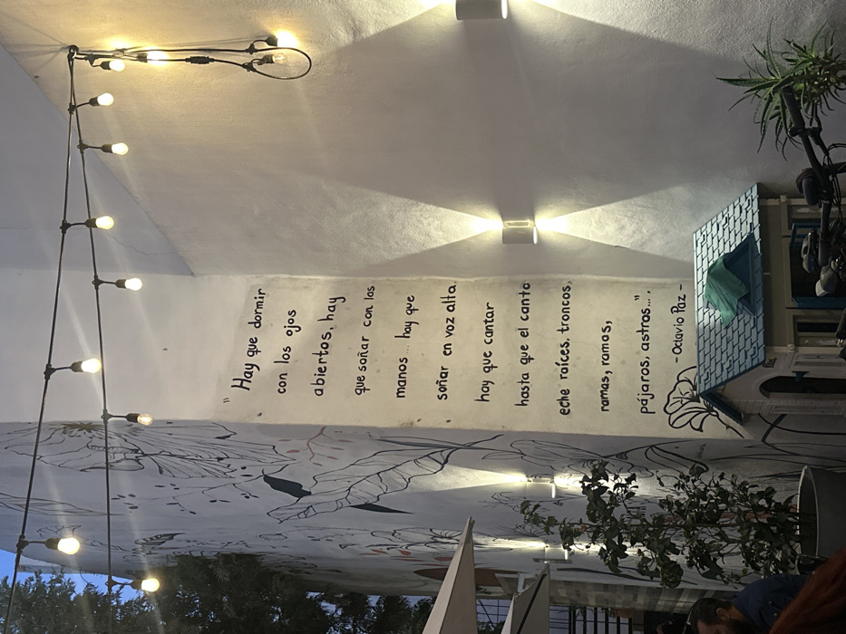 A wall adorned with string lights displays a poem. The lines, in Spanish, speak of dreaming with open eyes, using hands, and vocalizing dreams. It emphasizes singing until the song takes root, forming trunks, branches, birds, and stars. The poem is attributed to Octavio Paz. Above, modern wall sconces cast a warm glow. A mural with floral patterns is on the left, and foliage adds natural touches to the scene.