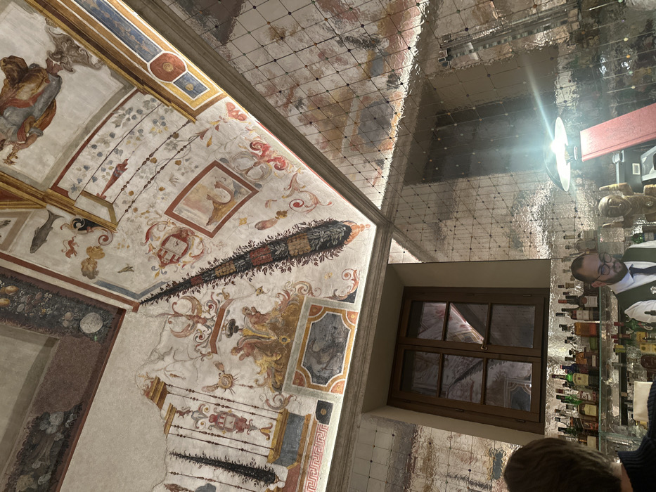 Elaborate ceiling frescoes adorn a room with an arched design. Decorative patterns, figures, and heraldic crests are prominent. Adjacent to the frescoed area, a modern mirrored ceiling with a grid pattern reflects the room, creating a distorted and doubled perspective. A window with a brown frame is visible on the right side, and part of a person's head can be seen in the bottom right corner.