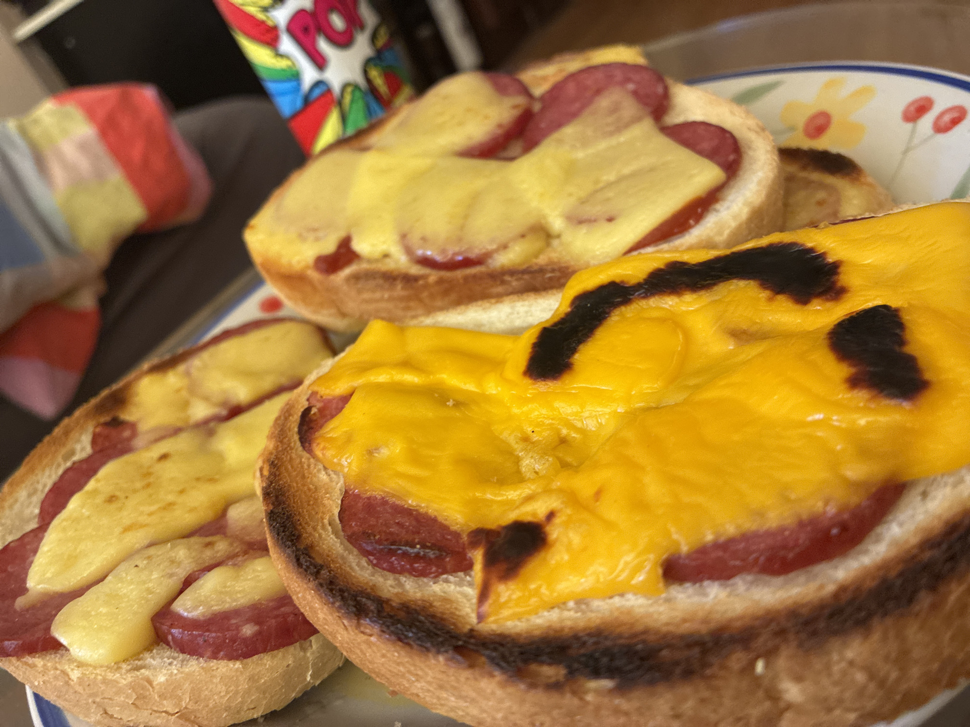 The image depicts a plate with three open-faced sandwiches. Each sandwich consists of a slice of toasted bread topped with slices of sausage and melted yellow cheese. The cheese on one of the sandwiches has some dark, burnt spots. The plate has a floral pattern with yellow and red flowers. In the background, there is a can with the word "Pop" visible and a patterned object. The image does not provide information about the location of Sofia, Bulgaria.