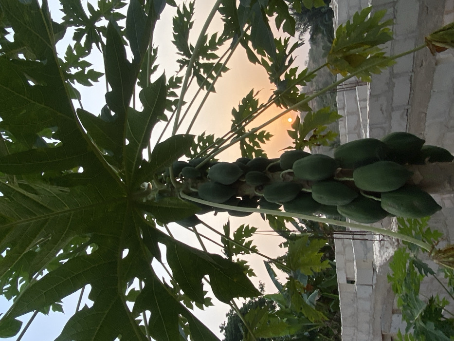 - "A low-angle shot of a papaya tree displays large green leaves spread towards the sky, silhouetted against a bright sunset" by FM-6XMFv1, licensed under CC BY 4.0