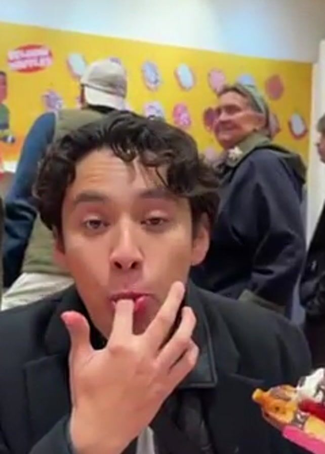 A young man with dark curly hair, wearing a black coat and gray top, is eating a waffle topped with strawberries, whipped cream, and chocolate sauce. He licks his fingers and then smiles at the camera, showing his teeth. He's sitting at a table covered with a red and white checkered tablecloth. Other people are in the background. A woman in a dark coat and a headscarf stands near a yellow wall decorated with images of waffles. Another person stands in the back wearing a black jacket. A purse sits on the table next to the man.