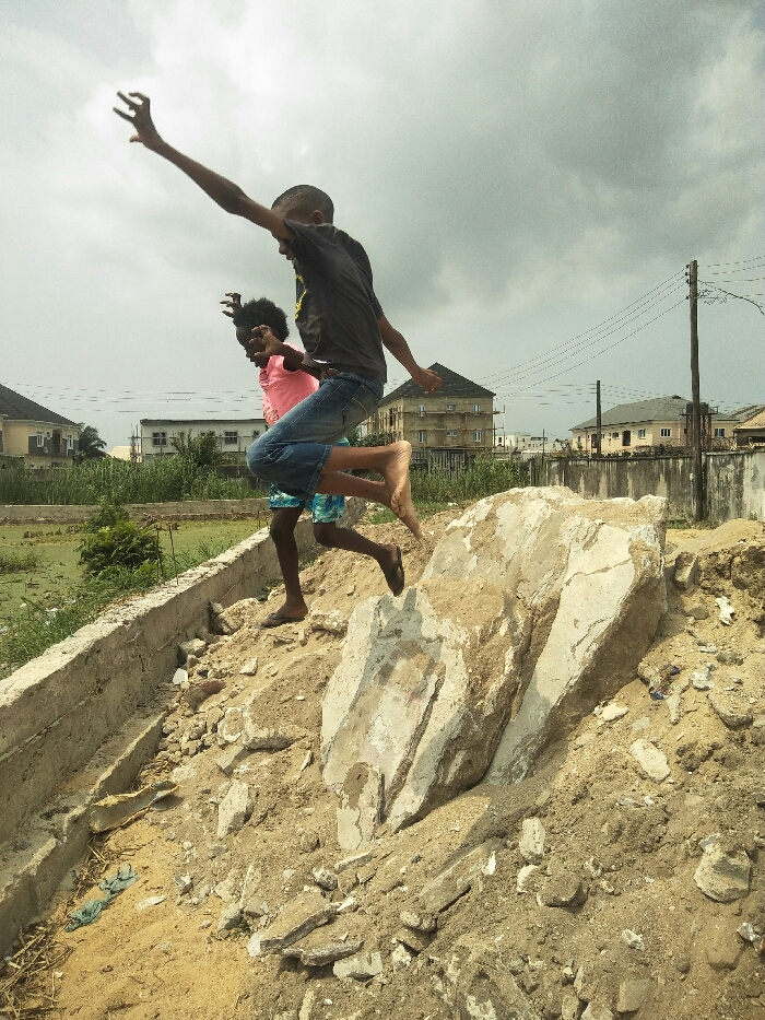 - "A daylight scene in Badore, Nigeria, depicts two individuals in mid-air above a construction debris pile" by FM-JHe4C3, licensed under CC BY 4.0