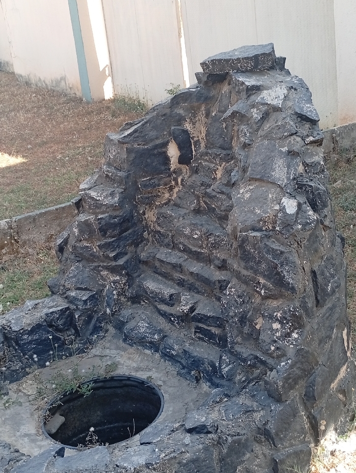 An artificial rock formation, approximately 1.5 meters tall, stands in an outdoor area in Ungwan Liman, Nigeria. The structure is predominantly dark grey to black, textured to mimic stacked natural rocks, with visible white and light grey discoloration indicative of weathering or paint degradation. At the base of the structure, a circular, dark-lined basin, partially obscured, contains minimal water and sparse green vegetation. The surrounding ground consists of dry, light brown grass and exposed soil with scattered green weeds. In the background, a segment of a light-colored building wall with a vertical blue stripe is visible under natural daylight. No individuals are present.