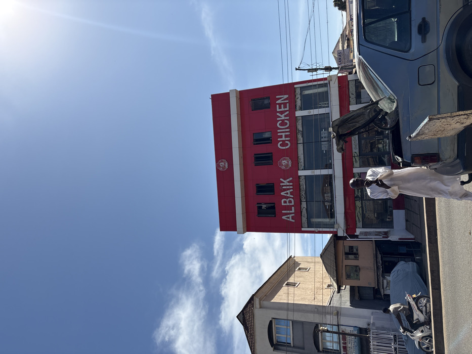 The image captures a street scene in Jos, Nigeria, under a clear blue sky with sparse white clouds and direct sunlight from the upper right. A three-story commercial building with a bright red facade and white accents dominates the center-right, featuring large ground-floor windows and smaller rectangular windows on the upper two floors. The building prominently displays "ALBAIK CHICKEN" in white capital letters across its middle section, with circular logos visible above the text and on the top floor. To the left of the red building, a two-story structure with a beige and grey exterior and a dark, pitched roof is visible, with a smaller, brown single-story building situated between it and the red edifice. In the foreground on the right, the rear portion of a light-colored sedan is visible, its trunk open to reveal a dark, covered item inside. A metal barrier rests behind the car. A man with dark skin, bald, and wearing a long white garment stands on the street or curb near the sedan, holding his hands together near his chest. Further left in the mid-ground, a second man with dark skin is seated on a white motorcycle. A blue tarp or cover is partially visible on the street behind the motorcycle. Overhead power lines and utility poles are present on the right side of the frame, with indistinct background buildings, one displaying part of the name "SANAS."