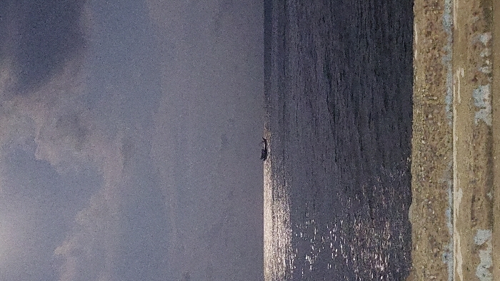 The image presents a coastal scene in Lhokseumawe, Indonesia. The upper third features a dark, overcast sky with diffused lighter cloud formations. The middle ground is occupied by open water, displaying dark grey-blue tones and surface ripples. A prominent horizontal band of intense light reflection traverses the water, located approximately one-third down from the top edge. Within this reflective band, a small, dark-hulled vessel, consistent with a fishing boat, is observed floating. The boat's specific details are obscured by its silhouette against the glare. The lower fifth of the frame reveals a weathered, horizontal concrete or stone barrier along the immediate foreground, exhibiting granular textures and mottled beige-grey coloration. No individuals are discernible within the visible frame.