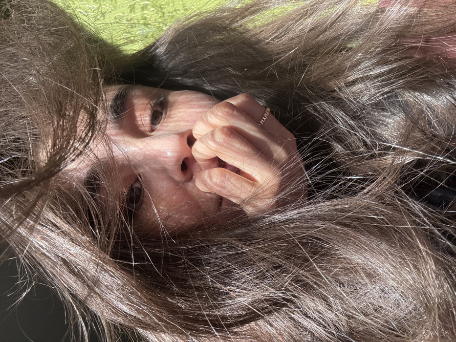 A close-up portrait of a female individual is captured outdoors in Tashkent, Uzbekistan. The subject's face is partially framed by long, dark brown hair, which appears disheveled and illuminated by direct sunlight, creating bright highlights and casting shadows across her face. Her right hand is raised, with fingers partially covering her mouth and chin. A thin, possibly gold, ring with a patterned band is visible on the ring finger of her right hand. Strong, natural light illuminates the scene, casting distinct shadows from her hair onto her forehead and cheek, and from her fingers onto her mouth area. Her eyes, with visible brown irises, are open and directed slightly downwards. The background is largely blurred, showing bright green vegetation or grass on the right side and a darker, indistinct area on the left.