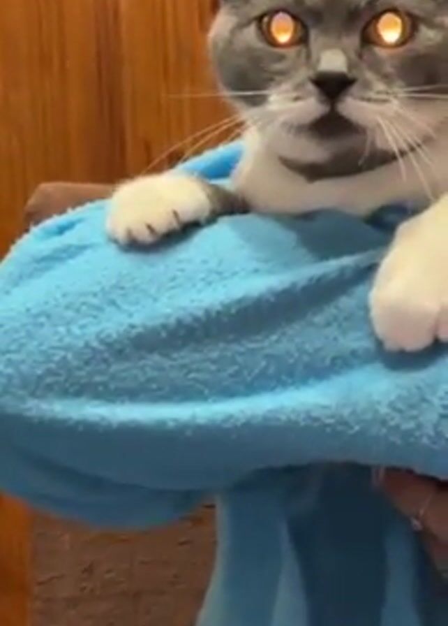 gray and white cat held in a blue blanket