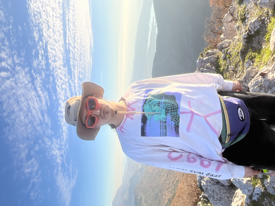 A person wearing a tan hat, pink sunglasses, and a long-sleeved white shirt with a blue and green graphic stands on a rocky mountain overlook. The sky is blue with patchy clouds above a hazy mountain range. The person's clothing includes text on the shirt and sleeve. The background landscape stretches into the distance, blending with the horizon.