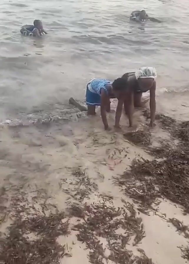 Several people are in the water at a beach, some using inflatable tubes. Two individuals, both wearing swimsuits, are crawling on the beach in the shallows, amidst seaweed. One is wearing a white swim cap.