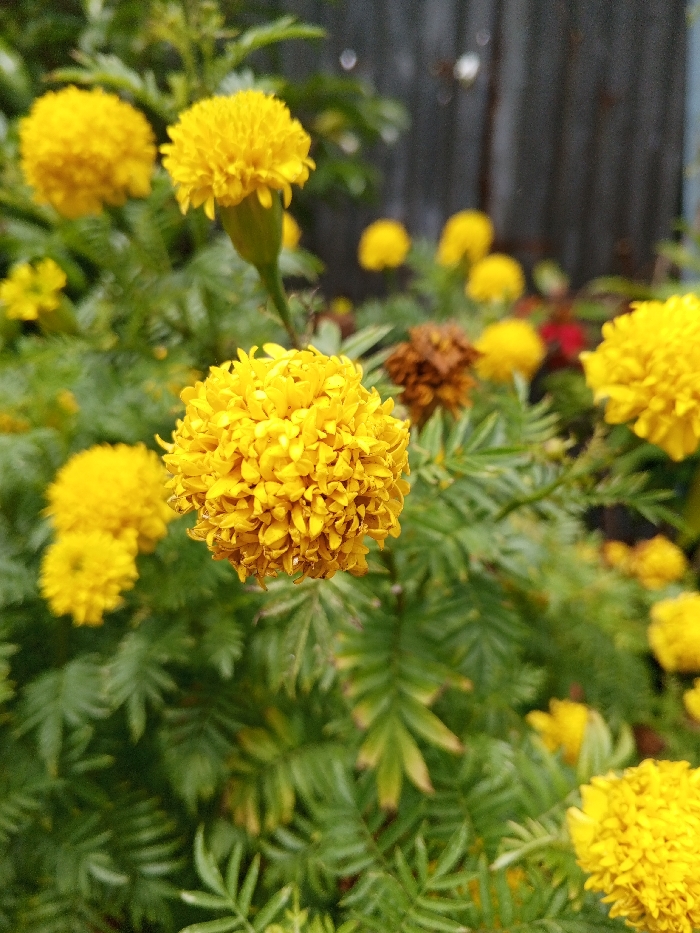 An outdoor, close-up photograph depicts a cluster of blooming marigold flowers (Tagetes) within a garden environment in Catarman, Philippines. The foreground is dominated by a large, spherical, vibrant yellow marigold bloom, sharply in focus and positioned slightly right of center. Its petals are densely packed and a rich golden-yellow hue. Surrounding this central flower are numerous green, serrated marigold leaves, also in varying states of focus. Several other yellow marigold flowers, some partially obscured and others blurred, are visible throughout the mid-ground and background. Notably, a single dried, brown marigold bloom is present in the mid-ground, slightly behind and to the right of the main subject. The background features additional blurred green foliage and, on the upper right, a vertical, dark gray, corrugated metal surface, likely a fence or wall. The scene is static, devoid of human presence or active interactions.
