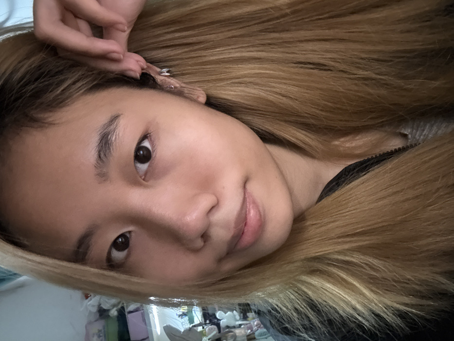 The image displays a close-up, chest-up portrait of a young adult female, taken indoors in Nan'an District, China. The individual has a light complexion, dark eyes, defined eyebrows, and light-colored lips, displaying a neutral expression with a slight smile. Her long, straight hair, light brown to blonde in color, is visible cascading over her shoulders. She wears a dark, zippered outer garment over a grey inner layer. Her right hand is visible, with fingers positioned near her right ear, which features multiple small silver-colored earrings or ear cuffs on the helix and lobe. The background is out of focus, showing an indoor environment with various light-colored, soft objects, possibly plush items or fabrics, arranged on shelves or surfaces, along with a partial view of a white fan-like fixture on the left. The scene is illuminated by diffused frontal lighting.