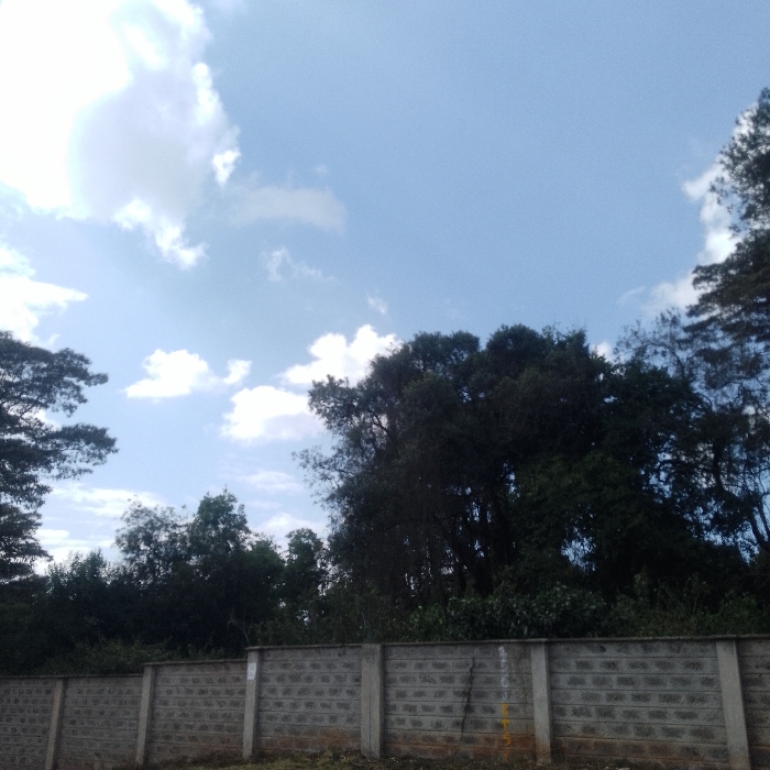 This image, captured in Nkaimurunya ward, Kenya, presents an outdoor landscape under a clear blue sky with scattered white cumulus clouds. The foreground features a grey concrete block wall, horizontally laid, supported by vertical concrete posts at regular intervals. Minor cracks are visible across various sections of the wall, with a faint yellow marking partially visible on one of the central concrete posts. Behind the wall, a dense line of green foliage transitions into a background of numerous tall, dark green trees with full canopies, dominating the middle ground and upper sides of the frame. The ground immediately in front of the wall appears to be dry earth or dirt. No individuals, animals, or other artificial structures are discernible within the scene. The overall lighting suggests a bright, daytime setting.