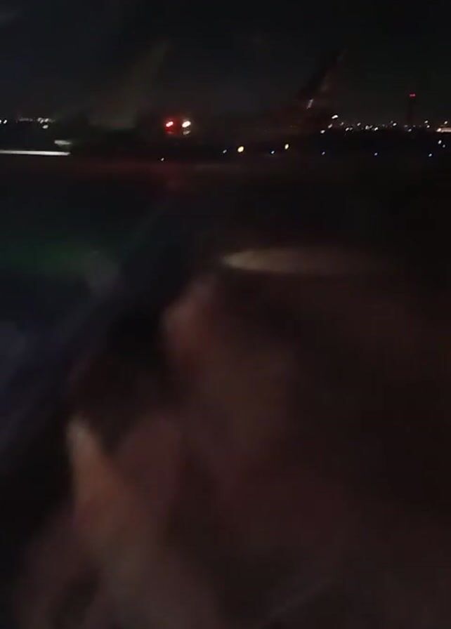 From a dimly lit viewpoint, a person is seen seated near an airplane window, gazing out at the airfield at night. The view through the window features an airplane tail and the runway illuminated by a scattering of lights. An announcement on U.S. law can be heard playing in the background.