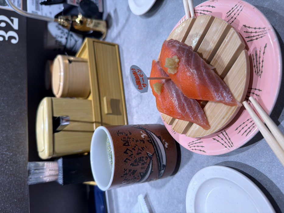 - "Two pieces of salmon nigiri adorn a wooden platform atop a pink patterned plate, accompanied by chopsticks" by FM-fFpNh1, licensed under CC BY 4.0