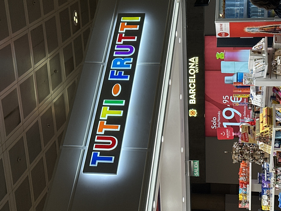 This image depicts the interior of a retail establishment, specifically a duty-free shop located within Barcelona-El Prat Airport in El Prat de Llobregat, Spain. The focal point is a large, brightly illuminated sign overhead, displaying the word "TUTTI FRUTTI" in multi-colored block letters (red, orange, green, blue, purple, yellow) with an orange oval separating the two words. Below this, a dark fascia features the white text "BARCELONA DUTY FREE" alongside a golden, stylized emblem. To the left, a green "SALIDA" (Exit) sign with a white arrow is visible. Below the signage, a retail environment is presented with multiple white shelving units. These shelves hold various consumer goods, including bags of snacks or candies, small souvenir items on a rotating display stand, and boxes of Toblerone chocolate. A prominent red promotional sign displays "Solo Only/Només 19,95 €" next to a logo depicting a stylized candle with the word "AURORA." Further to the right, perfume bottles with blue and pink gradient colors, a small green bear-shaped figure, and a Coca-Cola branded refrigerator stocked with beverages are visible. The top right corner of a person's head and shoulder is partially visible behind the refrigerator. The ceiling consists of a grid pattern with integrated overhead lighting fixtures.