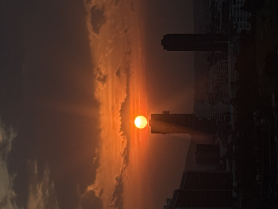 The image displays an urban skyline in Puebla City, Mexico, during either sunrise or sunset. The upper two-thirds of the frame are dominated by a sky exhibiting an intense orange and red gradient near the horizon, transitioning into darker, scattered clouds above. A bright, circular yellow-orange sun is centrally positioned, appearing directly above the apex of a prominent, multi-story skyscraper. Distinct crepuscular rays emanate downwards from the sun, casting shafts of light through the atmosphere. To the left of this central skyscraper, a broader, rectangular high-rise building is partially visible. Another slender, tall building is silhouetted to the right. The lower third of the image reveals a dense urban sprawl, with numerous buildings appearing as dark silhouettes against the vibrant sky. Faint topographical features, consistent with mountains or hills, are discernible on the distant left horizon. No individuals or specific actions are visible.