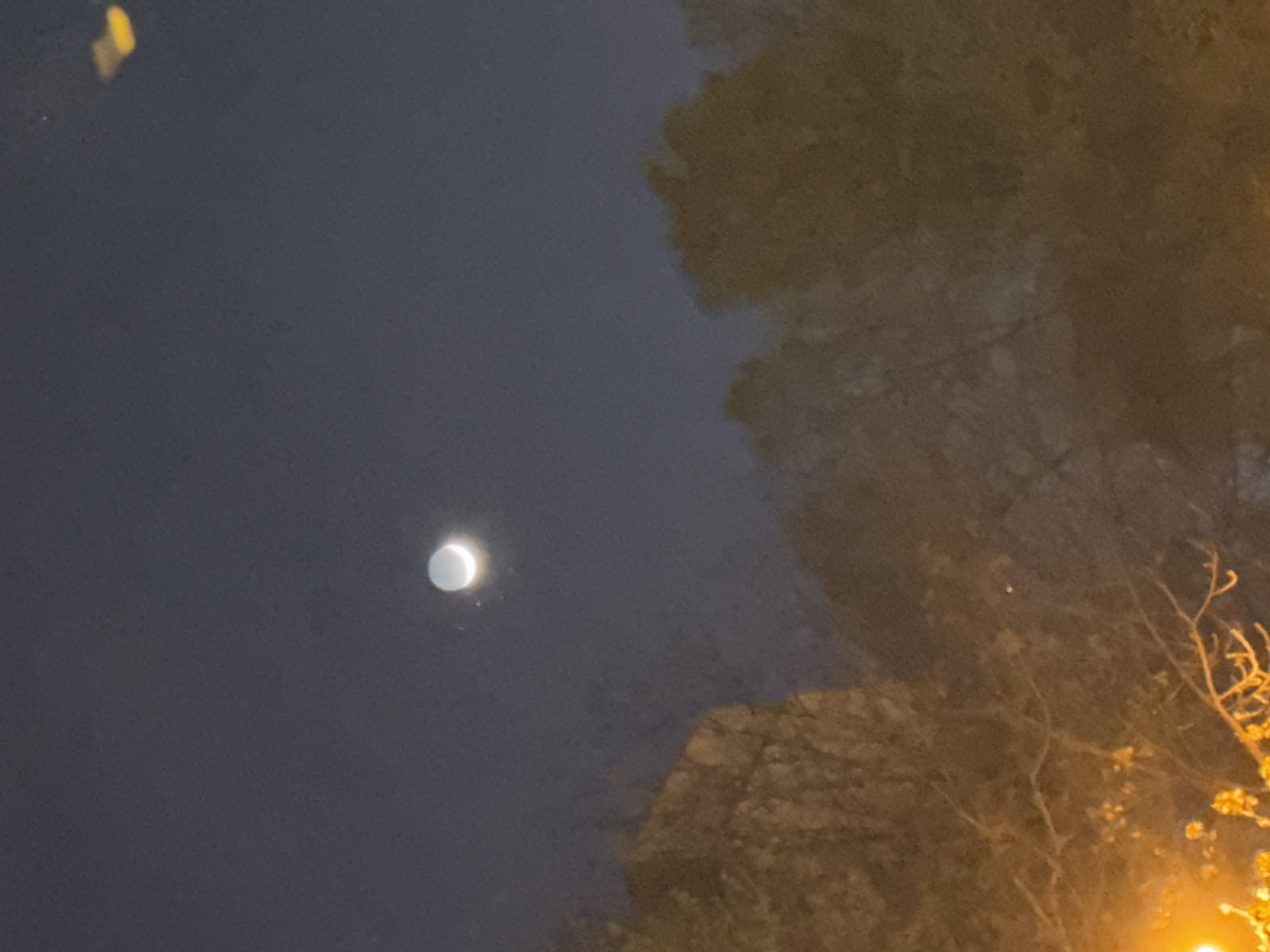 The image depicts a night scene in Sofia, Bulgaria. A crescent moon is visible in the dark sky, positioned in the upper-left quadrant of the frame. The lower-right quadrant shows blurred foliage, possibly tree branches and leaves, illuminated by an unseen light source, likely a street lamp. The overall composition suggests an urban environment with a mix of natural and artificial elements.