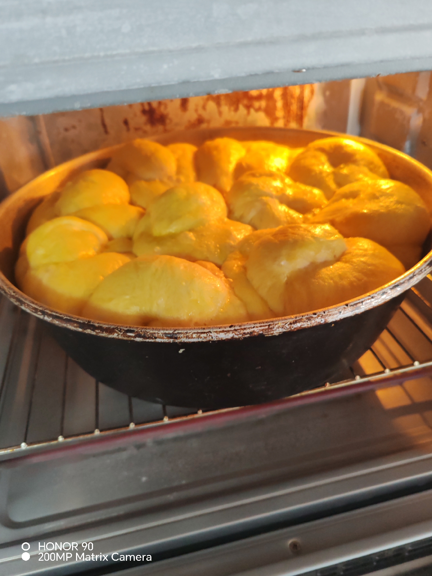 The image displays a dark-colored, round cooking pot positioned on a metal rack inside an oven. The pot contains numerous individual portions of yellow dough, consistent with proofed or partially baked sweet rolls or bread, which are expanding and merging. The dough surfaces exhibit a light yellow to golden-brown coloration, indicating ongoing baking. The oven interior is illuminated by a warm, orange-yellow light, suggesting active heating. Visible oven walls show some discoloration or residue. No individuals are present. The specific location within the city of Rosen, Bulgaria, is not discernible from the visual evidence. A watermark in the lower-left corner indicates the image was captured by an "HONOR 90 200MP Matrix Camera."