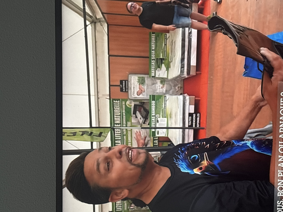 The image captures an indoor scene within a temporary structure, characteristic of an exhibition or market booth, situated in Sélestat, France. In the left foreground, a man with dark hair styled upwards, a goatee, and a black long-sleeved t-shirt emblazoned with a prominent blue eagle graphic is depicted in profile, facing towards the right. He is actively speaking, indicated by his open mouth and visible teeth. His hands are positioned in the lower right quadrant of the frame, holding a dark, folded item, possibly leather, over a blue object. Partially visible text at the bottom edge reads "...US. BON PLAN OU ARNAQUE?". The background presents a vendor booth featuring a white tent-like ceiling and brown, panelled walls. Multiple mattresses, encased in clear protective plastic, are displayed on red carpeted risers. Accompanying signage, written in French, advertises "LA LITERIE NATURELLE" (Natural Bedding), "MATELAS BAMBOO" (Bamboo Mattress), "MATELAS SOJA NATUREL" (Natural Soy Mattress), and an "LIT ÉLECTRIQUE" (Electric Bed), alongside "Toutes Dimensions Disponibles" (All Dimensions Available). Additionally, "Aloe Vera" branded promotional materials are visible. A green banner with partially visible text, possibly "FIEC," hangs on a vertical support. To the right, a second man, wearing a black t-shirt, blue denim shorts, and eyeglasses, stands behind the mattress display, looking towards the foreground with a smile.