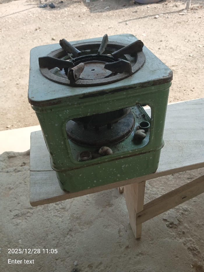An aged, green-painted, square-cased kerosene stove is positioned on a simple wooden plank, forming part of a rustic table