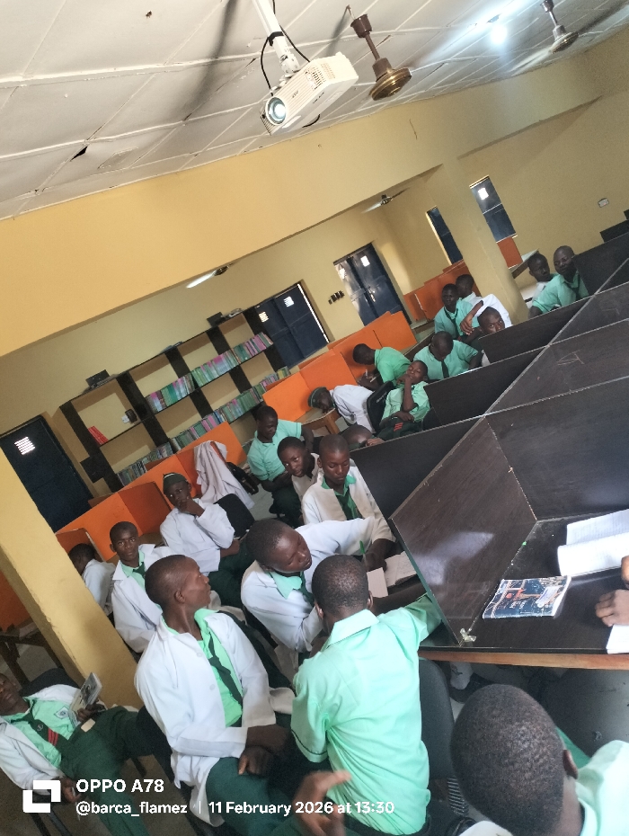 The image captures an indoor scene within an educational facility in the city of Rinze, Nigeria