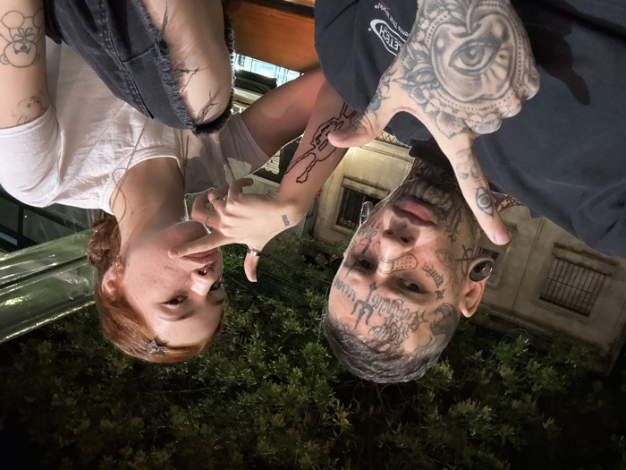 An upside-down photograph shows two people posing together. The person on the left has red hair and a white t-shirt, while the person on the right has numerous face tattoos and large ear piercings. Both are making hand gestures towards the camera. The background includes greenery and a building with windows. The image has a tilted perspective.