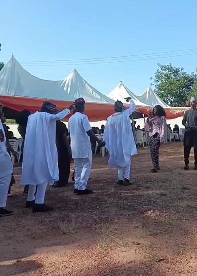 The scene features a group of people on a sandy area, with white tents in the background and a clear blue sky above. The group mainly consists of men dressed in white traditional attire. One man near the center, also in white, is dancing, lifting his arms in the air and stepping back and forth. A woman dressed in a patterned outfit stands nearby, facing the dancers. To the right, a man in a dark uniform appears to be observing the scene. In the distance, tables and chairs are set up under the tents, with more people seated. Overall, the atmosphere seems festive.