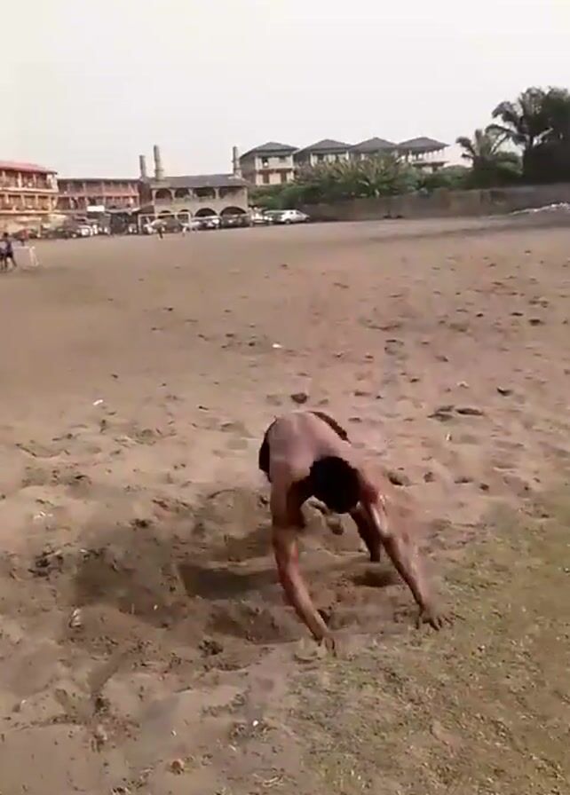 shirtless man performing a backflip on a sandy beach, stumbling upon landing. Buildings and several people are visible in the background. The scene then cuts to a grassy area where several shirtless men are standing around. One man is wearing red hair. Some discarded clothing items are on the ground.