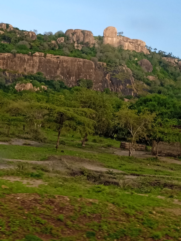 A landscape shows a rocky hill against a blue sky. A large, flat cliff-face descends into a green, tree-filled lower area. The top of the hill has large, rounded rock formations with sparse vegetation. In the foreground, sparse trees are scattered across the grassy area, with dirt patches visible. A stone-like structure is seen near the trees. The bottom of the frame is blurred, suggesting the view is from a moving vehicle.