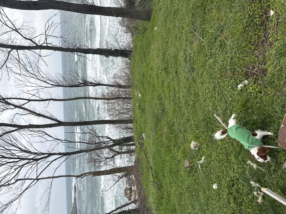 An elevated view in Tsarevo, Bulgaria, depicts a coastal landscape under an overcast sky. In the immediate foreground, a small tricolor dog, possibly a Cavalier King Charles Spaniel, wearing a bright green vest, is positioned on a leash on a patch of green grass and clover, facing right. Scattered debris, including white paper-like fragments, small branches, and clumps of white material, is visible across the grassy area. Beyond the grass, a line of several tall, slender deciduous trees with bare branches separates the foreground from the sea. Some tree trunks exhibit exposed wood or broken limbs, and one tree on the right side of the frame is partially covered in ivy. In the background, the Black Sea appears choppy with numerous whitecaps, indicative of rough conditions. To the far left, a grey stone or concrete breakwater extends from a rocky coastline into the turbulent water. The sky is uniformly grey and overcast. The scene suggests a cool, windy day, likely in late autumn, winter, or early spring given the bare trees.