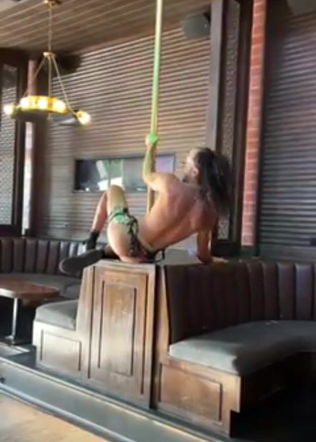 The video features a muscular, tan-skinned person with long, curly black hair and a trimmed beard sitting on a wooden platform. They are wearing a colorful, revealing swimsuit and black socks and shoes. They have one arm raised, touching a tall, vertical pole. The setting appears to be a bar or lounge, with a dark wood and upholstered bench-style seating in the background, and a hanging chandelier. The room has brick and corrugated metal walls. Music is playing in the background.