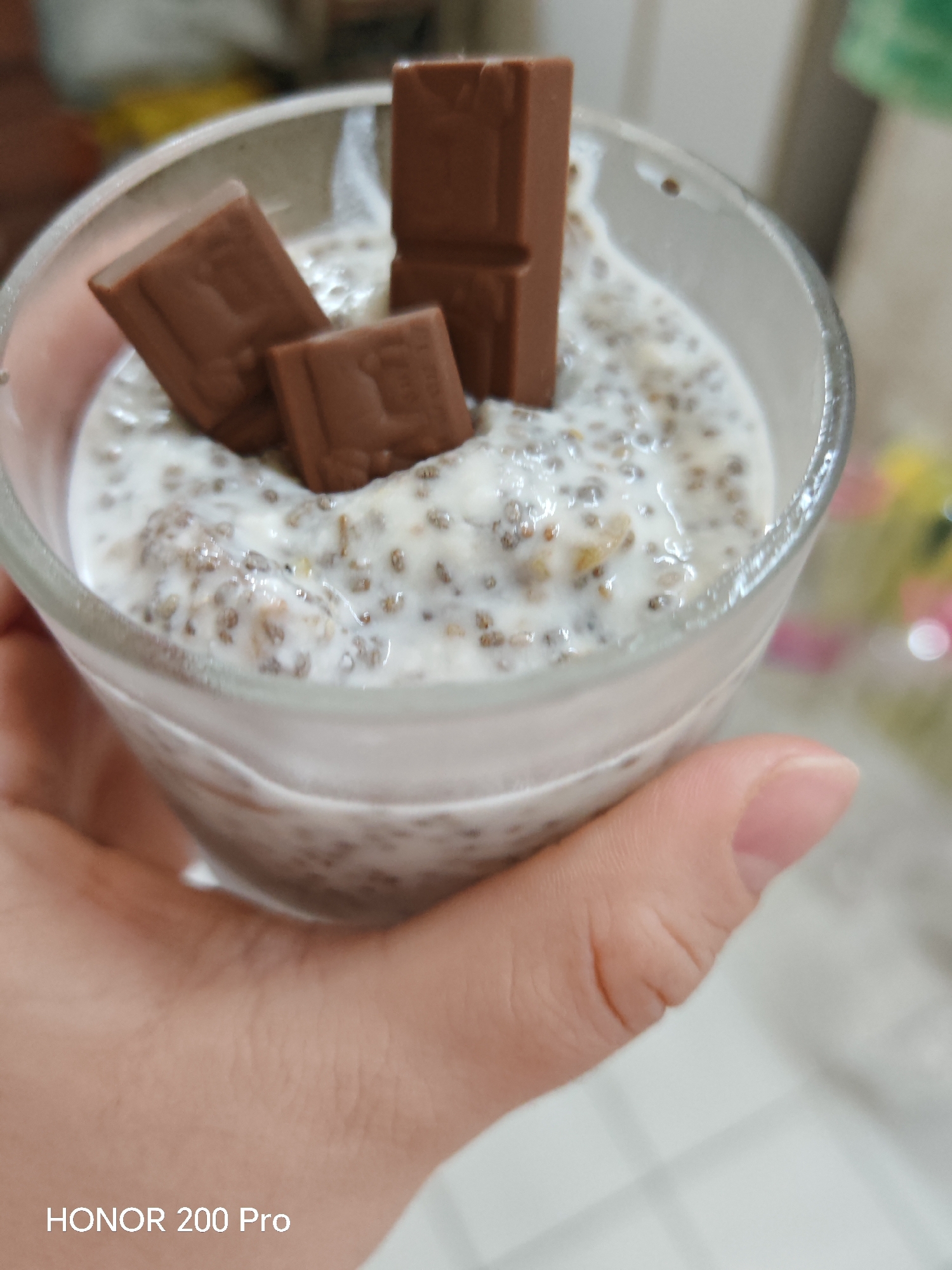 A clear glass, held by a human hand, contains a serving of chia seed pudding or overnight oats, characterized by small, dark seeds suspended in a creamy, white base. Three segments of milk chocolate are placed on the surface of the pudding, with one segment standing upright and two leaning. The hand, with light skin, grips the lower portion of the glass, its thumb visible on the right side. The background is blurred, showing indistinct shapes and colors suggestive of an indoor environment, possibly a kitchen or dining area, with hints of yellow and white elements. The scene is located in Haskovo, Bulgaria. The image was captured with an HONOR 200 Pro device, as indicated by a watermark in the lower-left corner.