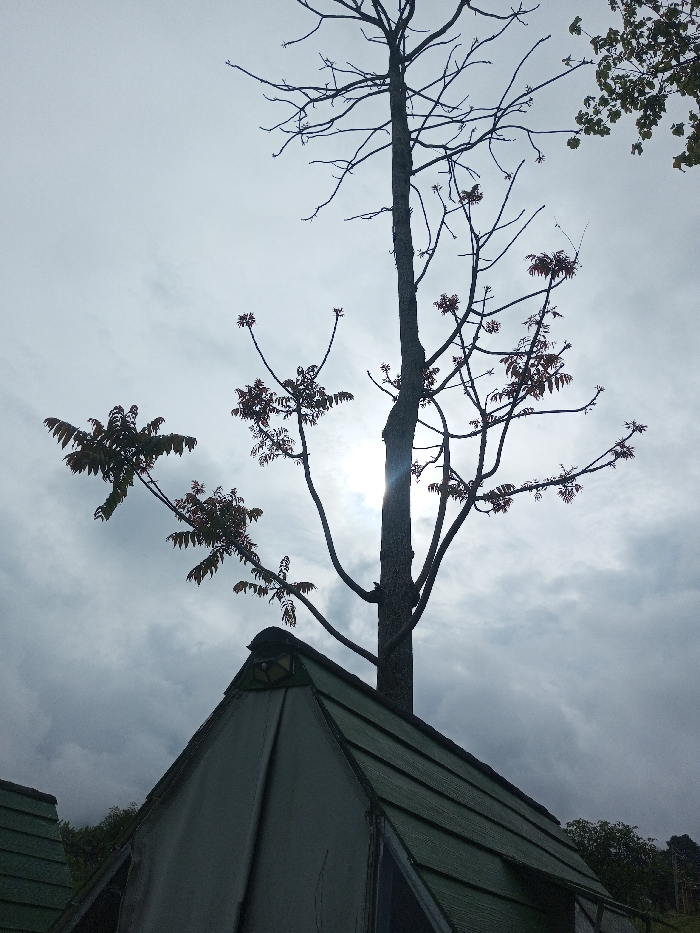 This image, captured in Abbireddygudem, India, presents a low-angle view upwards towards a sky overcast with grey clouds. A tall, slender tree trunk is centrally positioned, partially obscuring a bright light source, likely the sun, which generates a distinct lens flare effect. The tree displays numerous bare branches and clusters of new, reddish-brown leaves. To the left, a branch with darker, compound green leaves extends into the frame, while light green foliage is visible in the upper right. In the lower foreground, the upper portion of a structure is visible, featuring a steep, triangular roof covered in dark green, shingle-like material. The visible side of the building beneath the roof is light grey, potentially fabric or canvas, with vertical seams. A small, dark fixture, possibly a light or vent, is mounted at the apex of the triangular facade. A section of a similar adjacent roof structure is partially visible to the left. No individuals or active interactions are depicted.