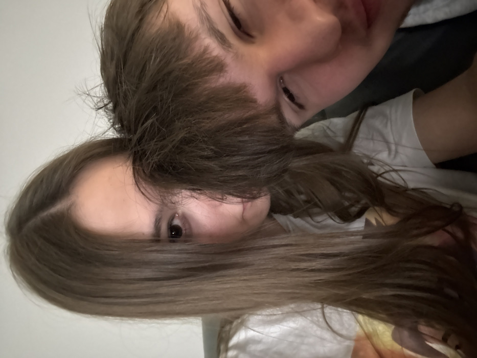 The image displays a close-up, front-facing view of two young individuals in an indoor setting. On the left, a female subject with long, straight brown hair, parted centrally, looks directly at the camera with her right eye. Her face is partially obscured by the hair of the second subject. She wears a white t-shirt. On the right, a male subject, positioned closer to the camera, has short, shaggy brown hair with bangs. His right eye is visible and slightly squinted, and the lower portion of his face, including a partial smile or expression, is visible. His hair partially covers the female's face. The interaction indicates close proximity. The background is an indistinct, light-colored wall or interior surface, providing no specific landmarks or environmental cues to identify the location as Plovdiv, Bulgaria, or any particular place within the city.