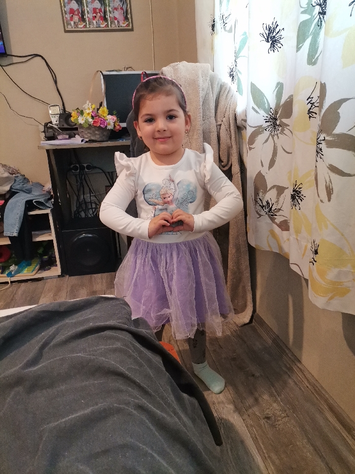The scene depicts an interior residential space in Obrochishte, Bulgaria. A young female child, estimated to be between three and six years old, stands centrally, facing the viewer with a slight smile. She has dark hair styled with a pink headband and small earrings are visible. Her hands are clasped at chest level, forming a heart shape. She wears a white long-sleeved shirt with puffed shoulders, featuring a graphic of Elsa from Disney's Frozen, depicted with blue wings and the word "QUEEN." Below this, she wears a light purple multi-layered tulle skirt over dark tights or leggings, and light blue socks. The background on the left features a light-colored wall with part of a flat-screen television visible in the upper corner, connected by black cables. Below it is a wooden-toned desk or shelf holding a white computer monitor, a small electronic device, and a woven basket filled with assorted artificial flowers (yellow, pink, purple, white). Numerous cables are visible behind and around these items. On the floor beneath the desk, a black speaker is situated next to a white modular shelving unit. This unit holds various items, including folded blue jeans and a pair of colorful sneakers (blue, yellow, green). To the child's right, a light-colored blanket or towel is draped over an unseen object, possibly a chair. Further right, a white curtain with a large-scale floral pattern, featuring designs in light yellow, green, grey, and black, covers a window. The flooring throughout the visible area is a light brown, wood-patterned laminate or vinyl. A dark grey fabric object, possibly a blanket or throw, partially obscures the lower-left foreground. The lighting suggests an indoor environment.