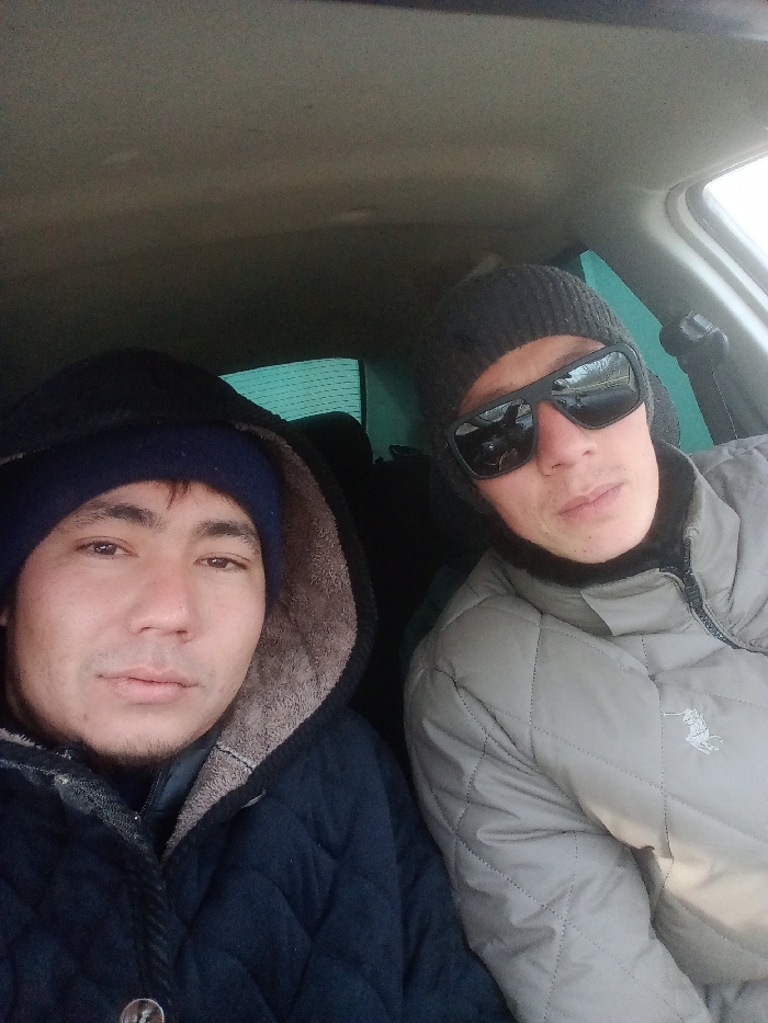 Two adult males are depicted inside a vehicle, presumed to be in Chimbay, Uzbekistan. The individual on the left is seated in what appears to be the driver's seat or front passenger seat, wearing a dark blue knit cap beneath a dark blue quilted jacket with a brown fleece-lined hood. He has dark hair and eyes, and a neutral expression, looking directly at the camera. The individual on the right is seated adjacent, wearing a dark grey knit beanie with ear flaps, black rectangular sunglasses, and a light grey quilted jacket featuring a dark zipper and a small, light-colored logo (resembling a polo player) on the left chest area. He also displays a neutral expression and looks towards the camera. The vehicle's interior features a light-colored headliner and a dark rear window with horizontal lines. The overall lighting suggests an outdoor daylight setting.