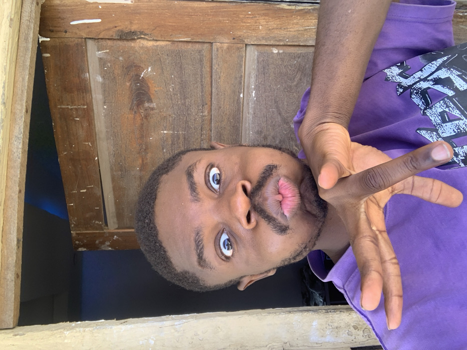 An individual, identified as a male of dark complexion, is depicted in a close-up frontal view within what appears to be a doorway or opening in Barakin Lerawi, Nigeria. The subject has short, dark, curly hair and discernible facial hair, including a mustache and beard. They are wearing a purple t-shirt with a partially visible graphic design on the lower right. The individual's face exhibits an exaggerated expression characterized by widely opened eyes, raised eyebrows, puffed cheeks, and pursed lips. The right hand is raised to approximately chin level, with the thumb, index, and pinky fingers extended, while the middle and ring fingers are flexed. The immediate background consists of a light-colored, possibly painted or plastered vertical surface on the left, and a weathered wooden door or partition on the right, featuring visible grain and sporadic white paint drips. A darker, undefined interior space is visible through the opening behind the subject. The scene is illuminated by what appears to be bright, natural light.