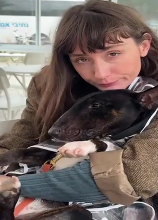 A woman with long brown hair and wearing a brown jacket is sitting down and holding a black-and-white bull terrier dog. The dog is wearing a shirt and harness. The woman is looking at the camera with a soft smile. In the background, there is a glass window and white tables and chairs, suggesting an outdoor cafe or restaurant setting. A sign with Hebrew writing is also visible in the background.