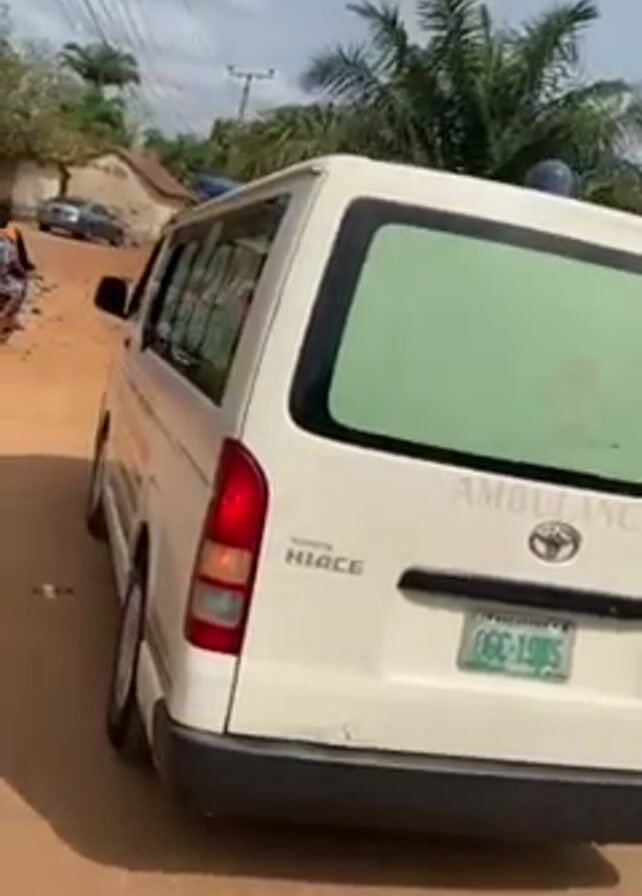 white Toyota Hiace ambulance parked on a dirt road. The ambulance has blue lights on top and the word "AMBULANCE" printed on the back. The license plate number is OGC-19NS. The video is shot from a lower angle, and the person holding the camera appears to be on a motorcycle. The background includes houses, trees, and power lines. The ambulance siren can be heard. A motorcycle passes the ambulance.