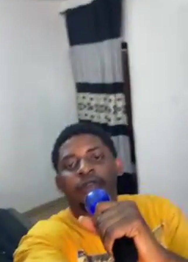 A man is singing into a toy microphone, seemingly recording a video for his own enjoyment