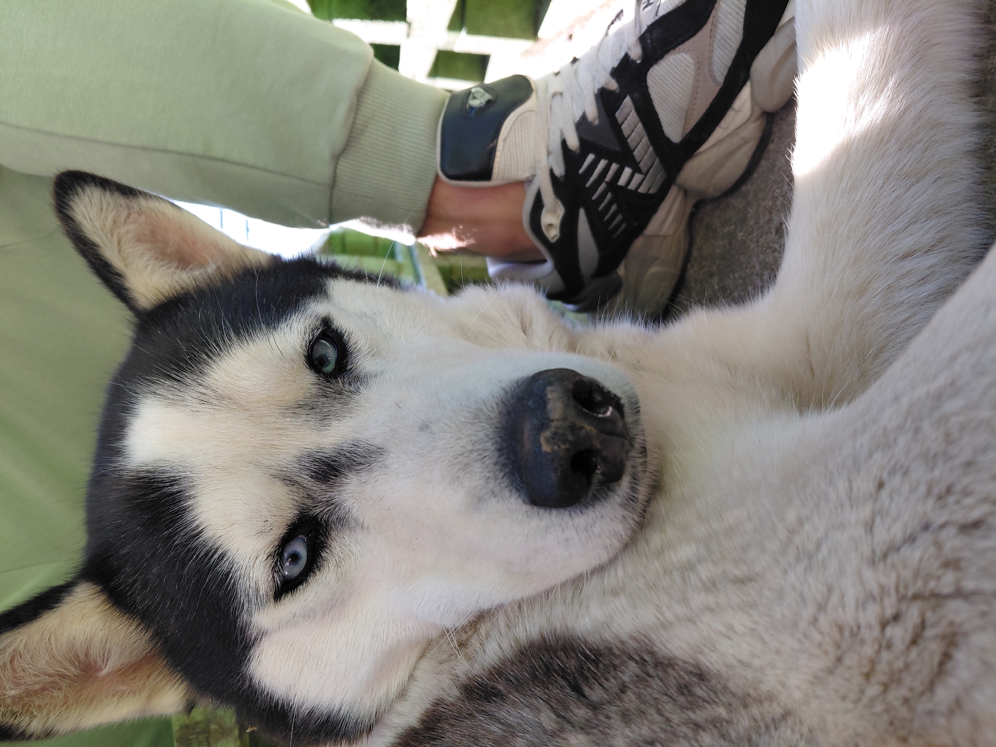 A husky dog with striking blue eyes lies near a person. The dog has black and white fur. A person's arm wearing a light green long-sleeved shirt is visible, and a foot in a white, black, and gray athletic shoe is near the dog. The location is Berkovitsa, Bulgaria.
