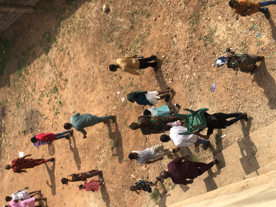 An aerial view captures an outdoor scene in Onitsha, Nigeria, on unpaved reddish-brown earth with scattered sparse vegetation and litter