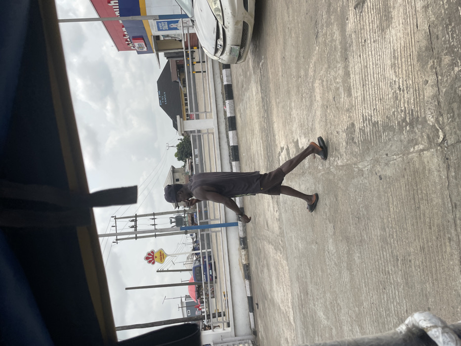 The scene depicts a man walking across a concrete paved area in a commercial district of Yenegoa, Nigeria, under an overcast sky