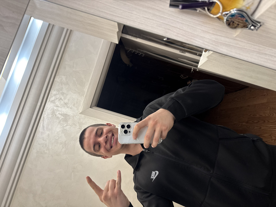 This image, captured in Dobrich, Bulgaria, depicts a young adult male taking a mirror selfie indoors